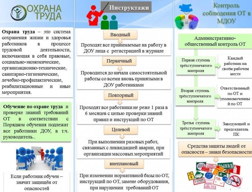 Нужно понимать, что работники детского сада в конечном итоге отвечают не только за свою безопасность, но и за безопасность порученных им воспитанников. Именно поэтому к ОТ в ДОУ предъявляются повышенные требования со стороны контролирующих органов. Организация её включает в себя нормативно-правовые, социально-экономические, организационно-технические, санитарно-гигиенические, лечебно-профилактические мероприятия, которые включают: